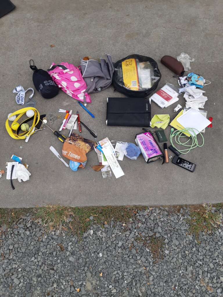 In order to organise and declutter my car, I first, took everything out and began by removing all of the obvious trash/rubbish. I found a single arm from sunglasses, wrappers, car park ticket, old receipts amongst other items. It is handy to use leftover grocery bags as trash bags to keep your trash in one space and regularly throw that out. These are all the items I took out of my car…